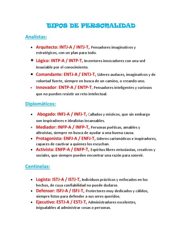 Si está en el camino de descubrir la carrera perfecta que mejor se adapte a su personalidad y sus locas habilidades, no busque más. For our purposes (and for brevity's sake), we. 0 calificaciones 0% encontró este documento útil (0 votos) 126 vistas. This identity difference probably influences every part of their lives in some way. Es probable que haya encontrado este artículo en una página de medium específicamente para diferentes rasgos de personalidad basados en la prueba de.. Según el indicador intj (introversión, intuición, racional (thinking), calificador (judging)), por si siglas en ingles hace referencia a los 16 tipos de.