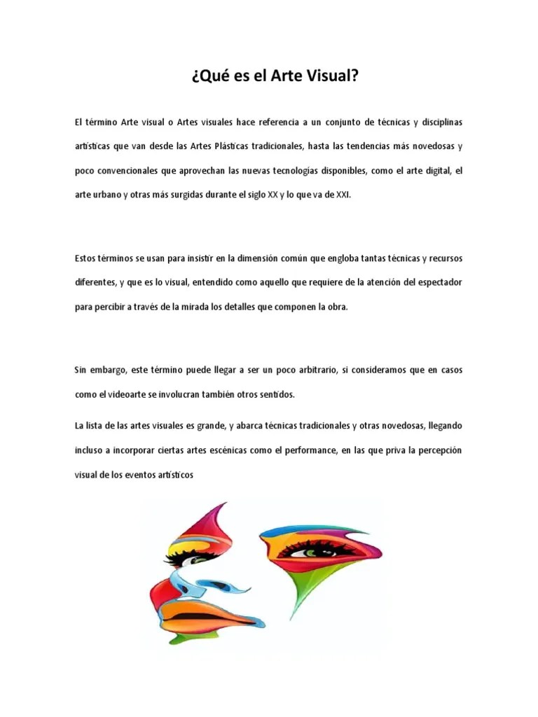 Las artes visuales son un conjunto de disciplinas artísticas, van desde las artes plásticas tradicionales, entre las que destacan el dibujo, la pintura, escultura y el grabado... Las artes visuales son un conjunto de disciplinas artísticas, van desde las artes plásticas tradicionales, entre las que destacan el dibujo, la pintura, escultura y el grabado. Su mayor componente es el visual, también llamado arte de los nuevos medios. El arte en general sirve como un vehículo de expresión. 26.05.2021 · descubre cuáles son las 7 artes y qué importancia tiene cada una de ellas en la vida del hombre.